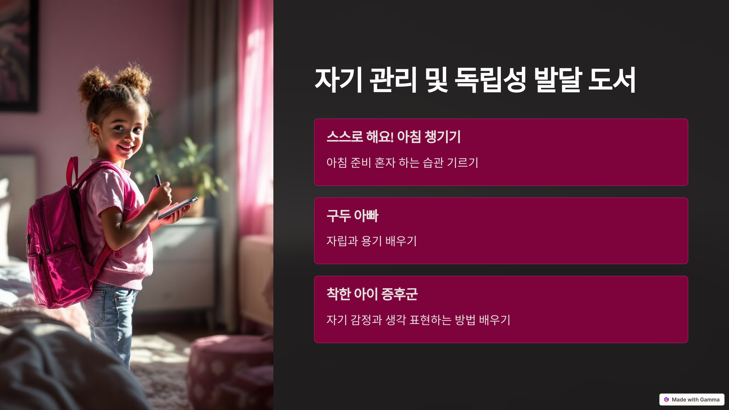 - 추천 이유: 초등학생이 되면 생활 습관을 스스로 챙기는 연습이 필요합니다. 이 책은 아이가 아침 준비를 혼자 할 수 있도록 돕습니다.