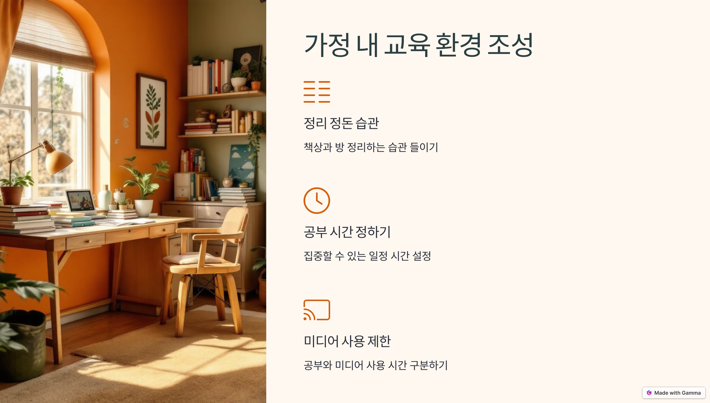 아이의 학습 환경은 가정에서부터 시작됩니다. 조용하고 정돈된 공간에서 공부할 수 있도록 하고, 학습 분위기를 만들어 주는 것이 중요합니다.