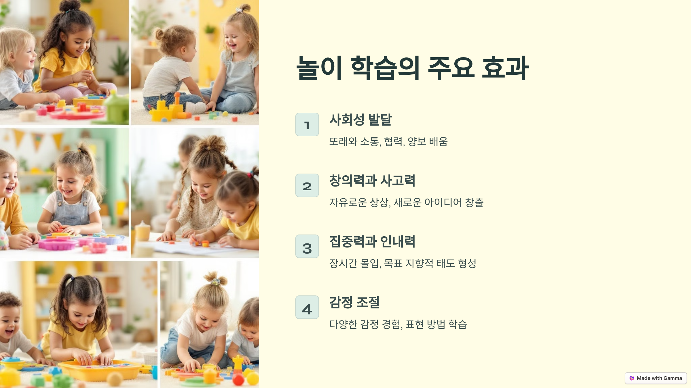놀이 속에서 아이들은 또래와 함께 어울리며 다른 사람과 소통하고, 협력하며, 양보하는 방법을 배우게 됩니다. 이는 학교 생활에서 친구들과의 관계 형성에 큰 도움이 됩니다.