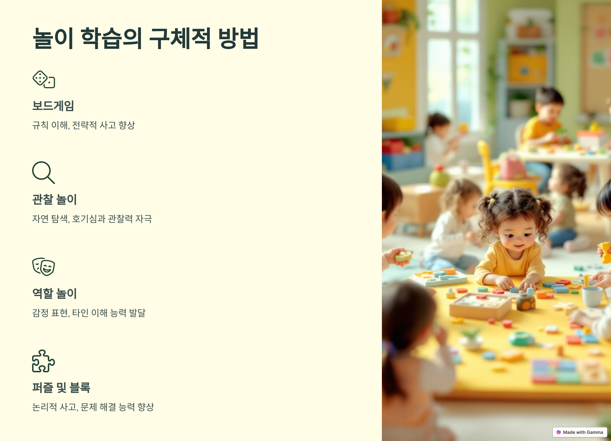 A1. 퍼즐, 블록 쌓기, 역할 놀이, 보드게임 등이 효과적입니다. 이러한 놀이를 통해 집중력, 사회성, 문제 해결 능력을 기를 수 있습니다.