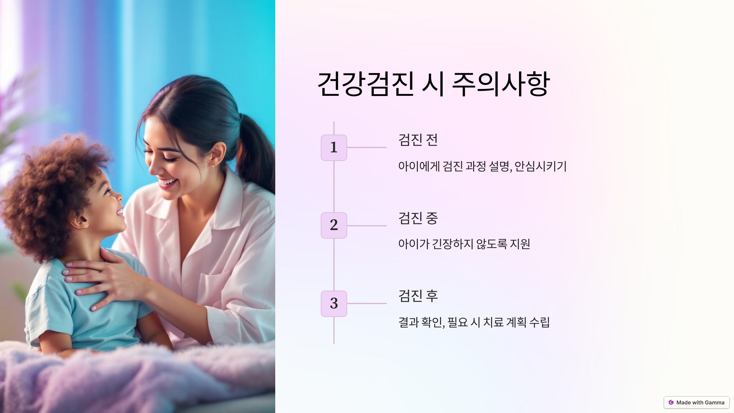 - 검진 전 충분히 설명해 주기: 아이가 검진을 두려워하지 않도록 어떤 검사를 받게 되는지 미리 간단히 설명해 주세요.