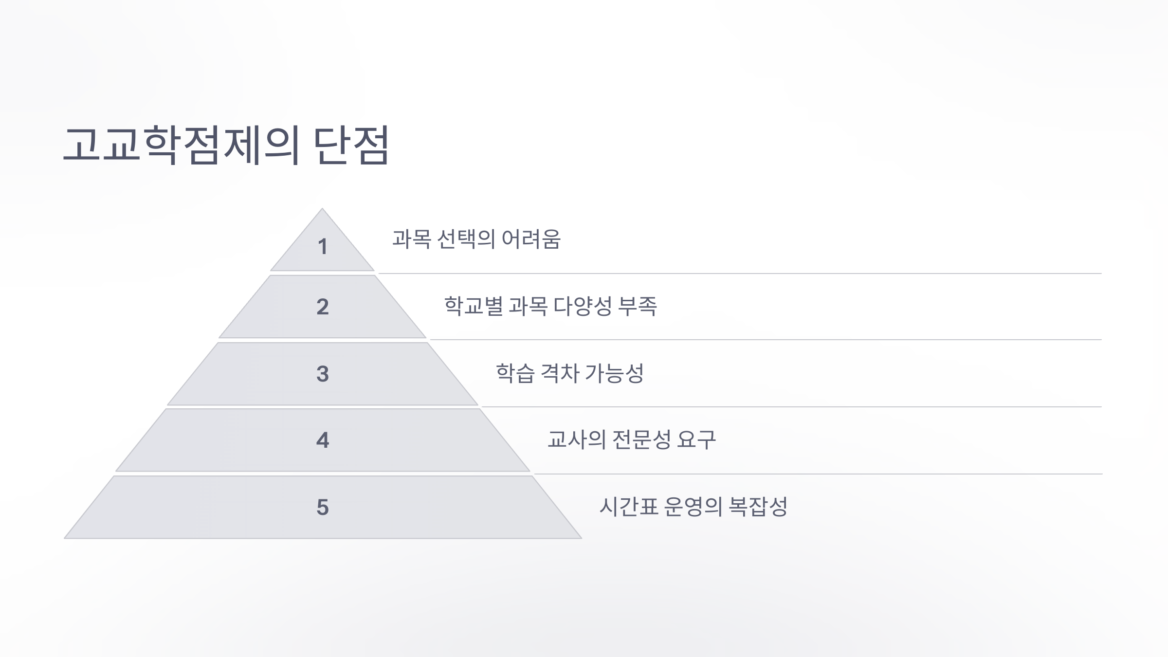 - 선택 과목에 따라 시간표가 달라져, 학교와 학생 모두 효율적인 운영이 어려울 수 있습니다.