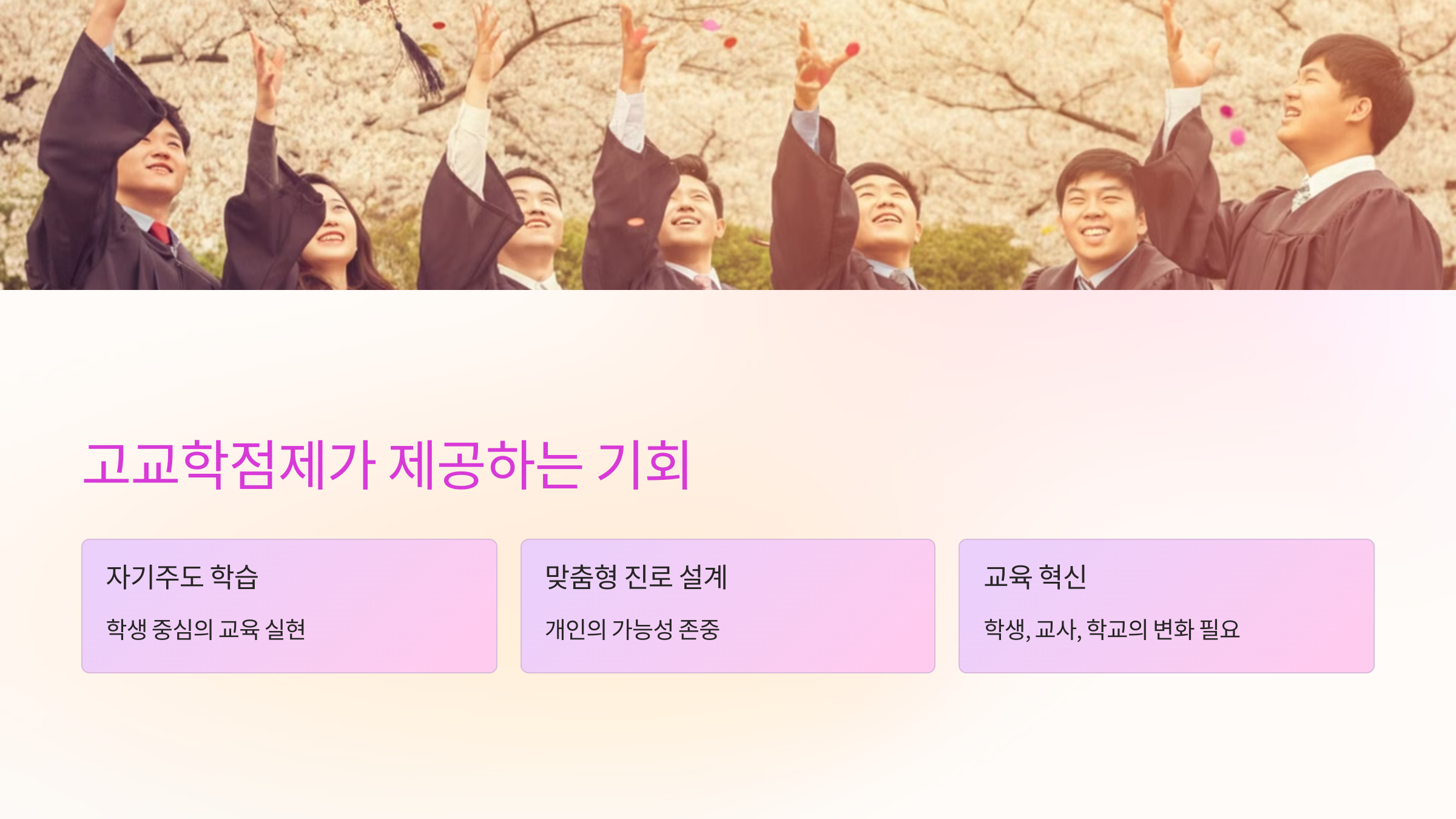 - 이처럼 고교학점제는 대학 입시뿐 아니라 학생 개개인의 역량 강화에도 중요한 역할을 합니다.
