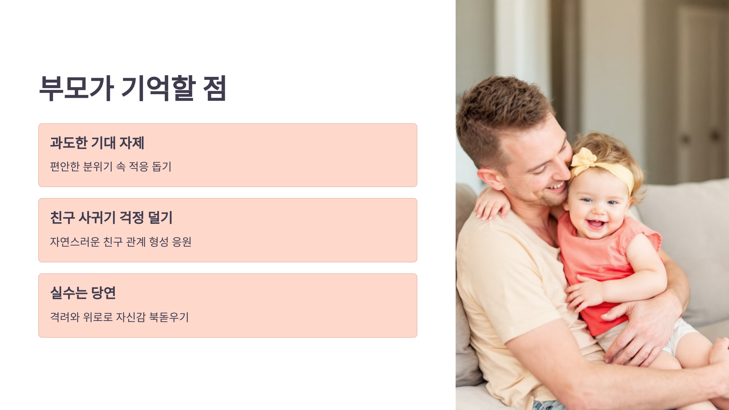 아이에게 "처음에는 조금 어색할 수 있지만 금방 친구가 생길 거야"라고 말하며 자연스러운 친구 사귀기를 응원해 주세요. 부모님의 응원이 아이의 자신감을 높여줍니다.