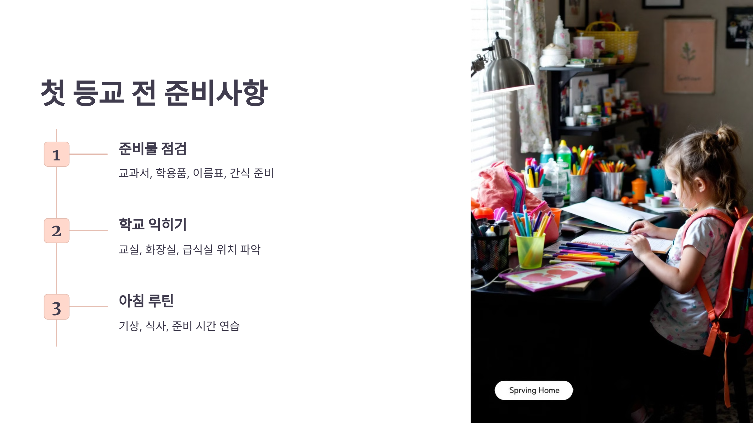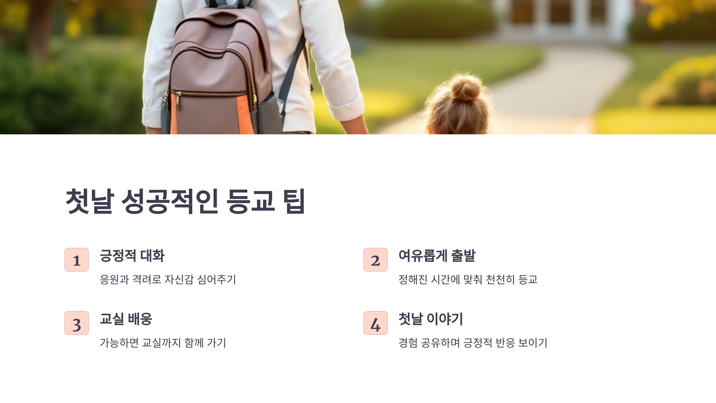 이렇게 일관된 아침 루틴을 연습하면 첫날뿐 아니라 이후의 학교생활도 훨씬 안정적이 될 수 있습니다.