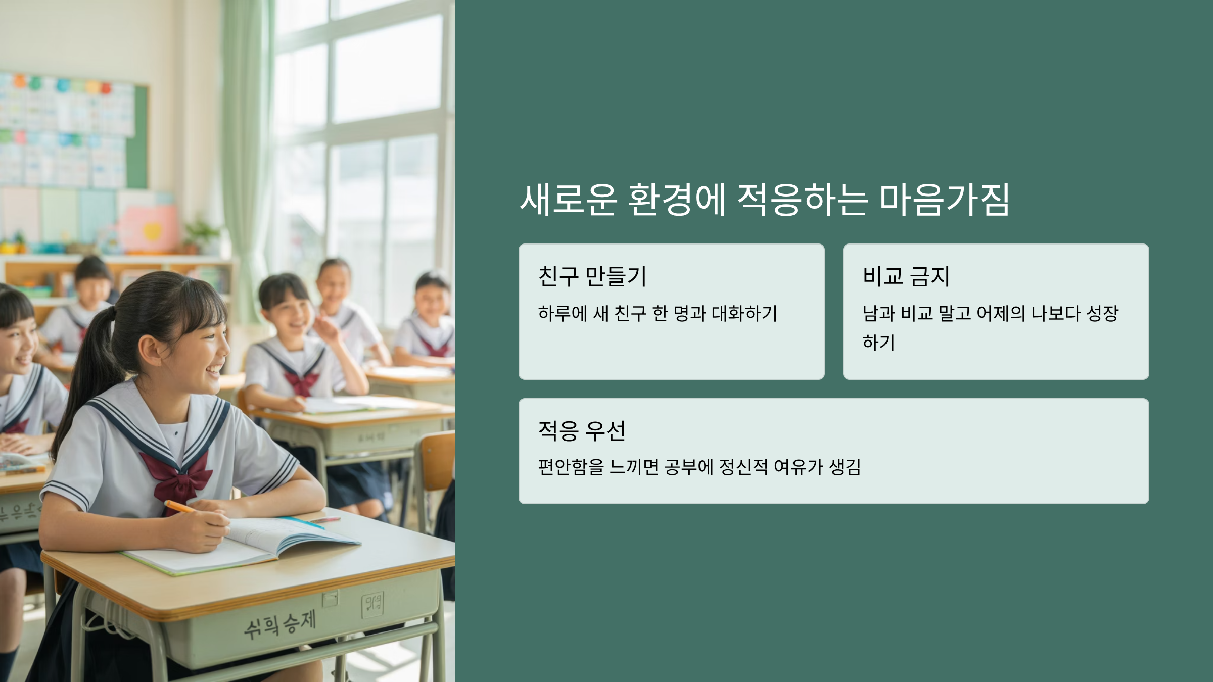 중학교에서는 새로운 친구, 선생님, 그리고 동아리·학급 행사 등 변화가 많습니다. 저는 입학 첫 달 동안 ‘친해지기’를 목표로 하루에 새로운 친구 한 명과 대화를 나눴어요. 이렇게 하면 점점 학교가 편안한 공간이 됩니다. 적응이 되면 공부에 쏟을 정신적 여유도 커집니다. 중요한 건 ‘비교’보다 ‘성장’에 집중하는 겁니다. 남보다 늦어도, 어제의 나보다 나아지면 성공이에요.
