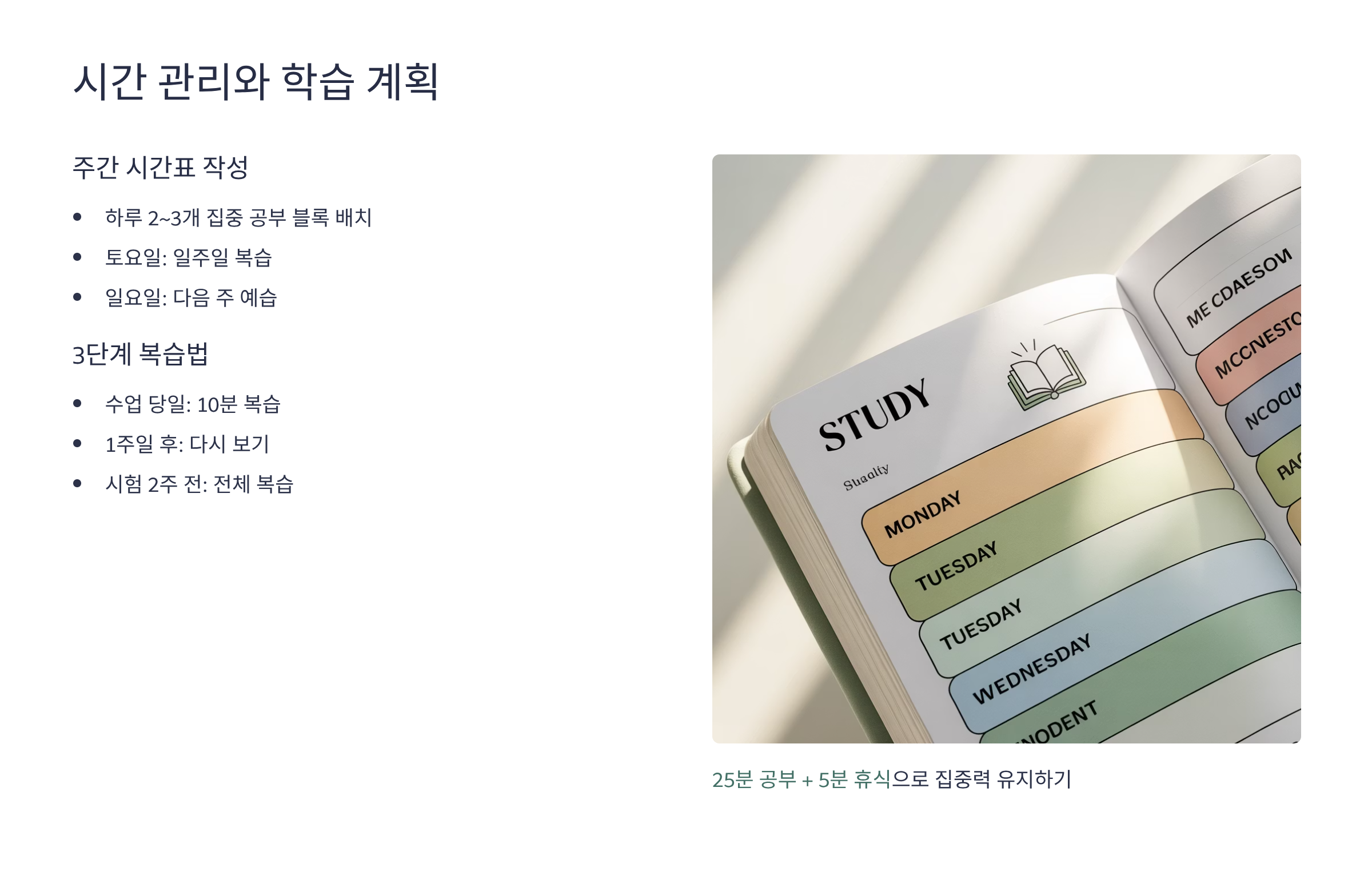 - 토요일·일요일은 복습+예습일: 토요일엔 일주일치 복습, 일요일엔 다음 주 예습