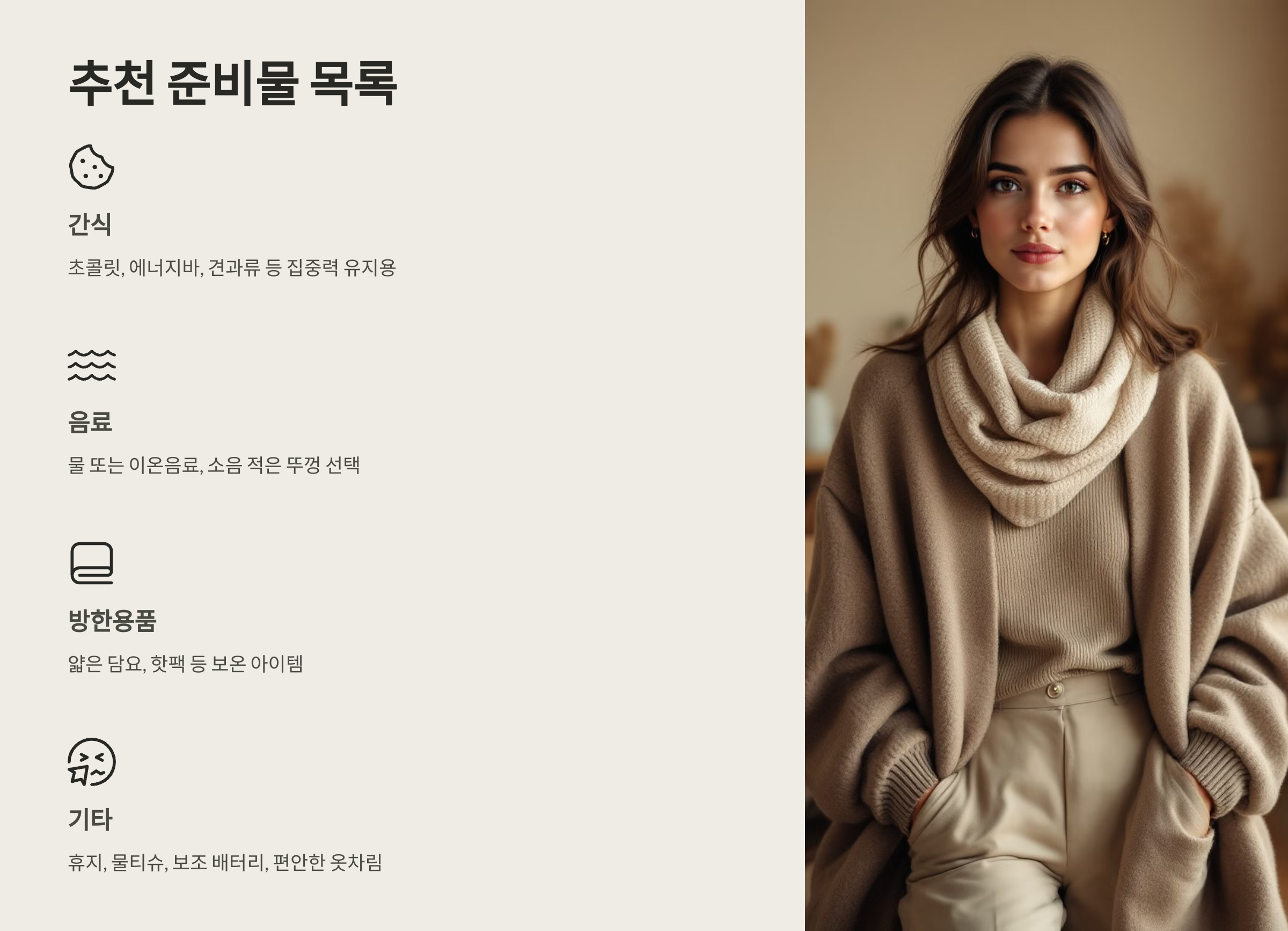 - 이유: 장시간 앉아 있어야 하므로, 편안하면서도 방한이 되는 옷차림을 준비하세요.