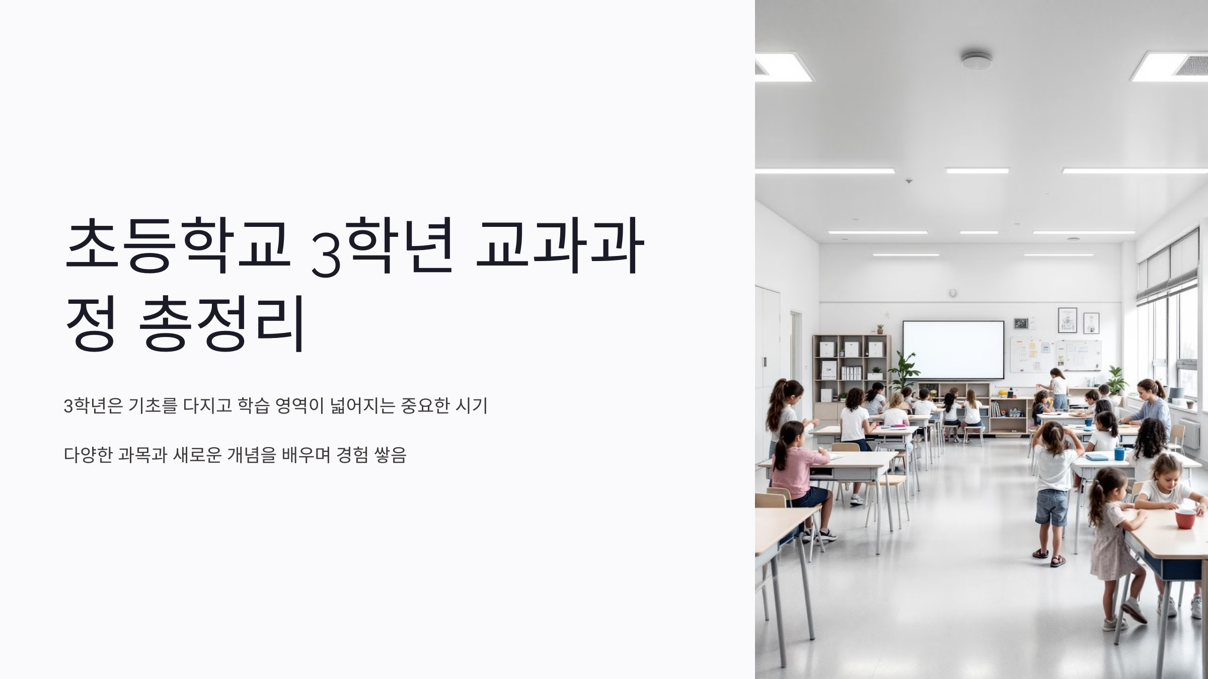 초등학교 3학년 교과과정은 다양한 학문과 예술 활동을 통해 기초적인 학습 능력을 다지고, 창의력과 사회성을 발달시키는 중요한 시기입니다. 학습을 통해 얻는 지식뿐만 아니라 친구들과 함께 협력하며 성장하는 방법도 배워나가는 시기죠. 각 과목에서 배우는 내용을 바탕으로 하루하루 성장하는 모습을 기대해봅시다!
