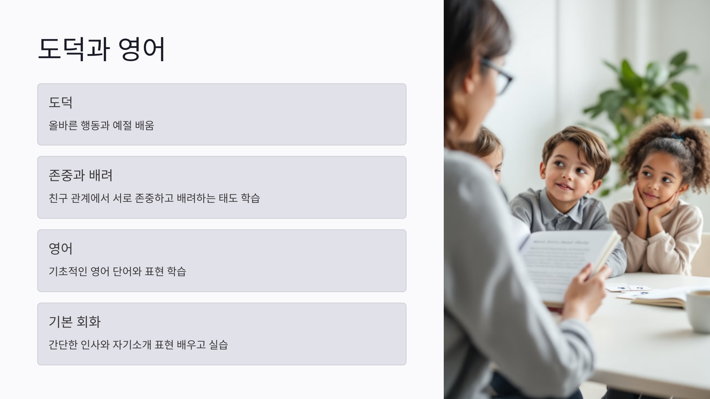 도덕 시간에는 올바른 행동과 예절을 배우고, 타인을 배려하는 마음가짐과 생활 속의 도덕적 가치를 이해하는 시간을 가집니다.