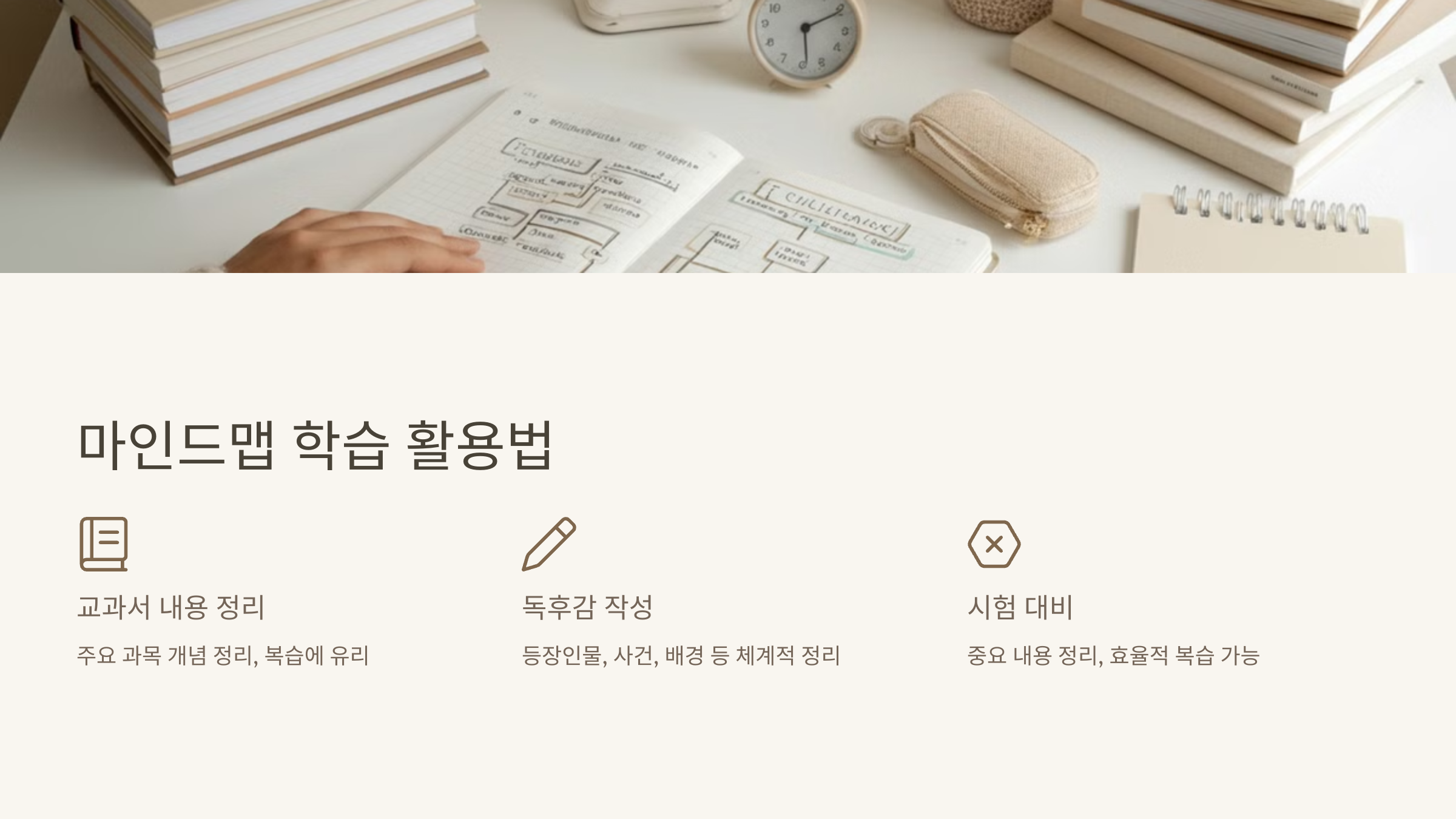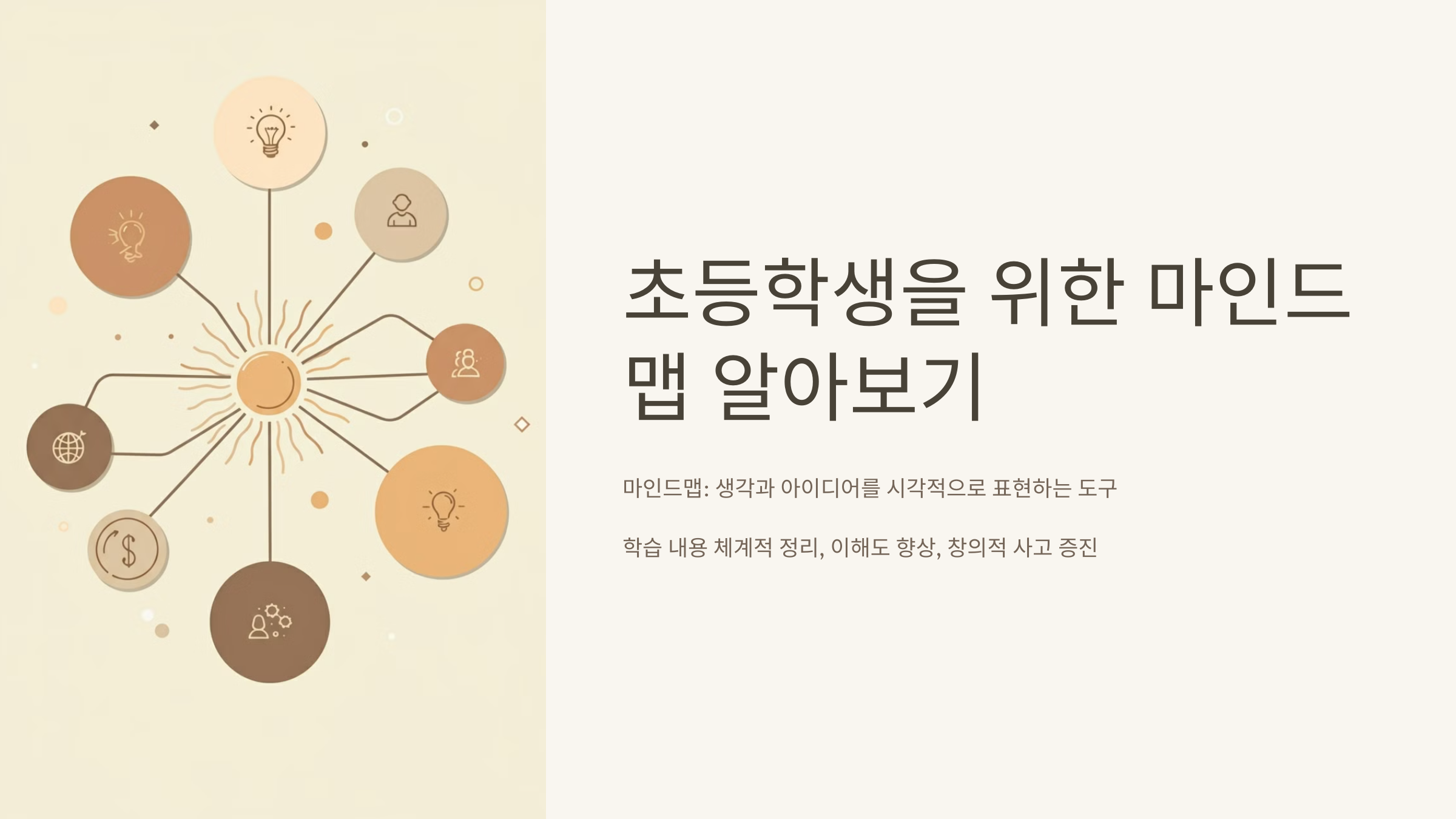 마인드맵은 시각적인 정보로 구성되어 있어 초등학생이 내용을 쉽게 이해하고, 중요한 포인트를 직관적으로 파악할 수 있게 도와줍니다.