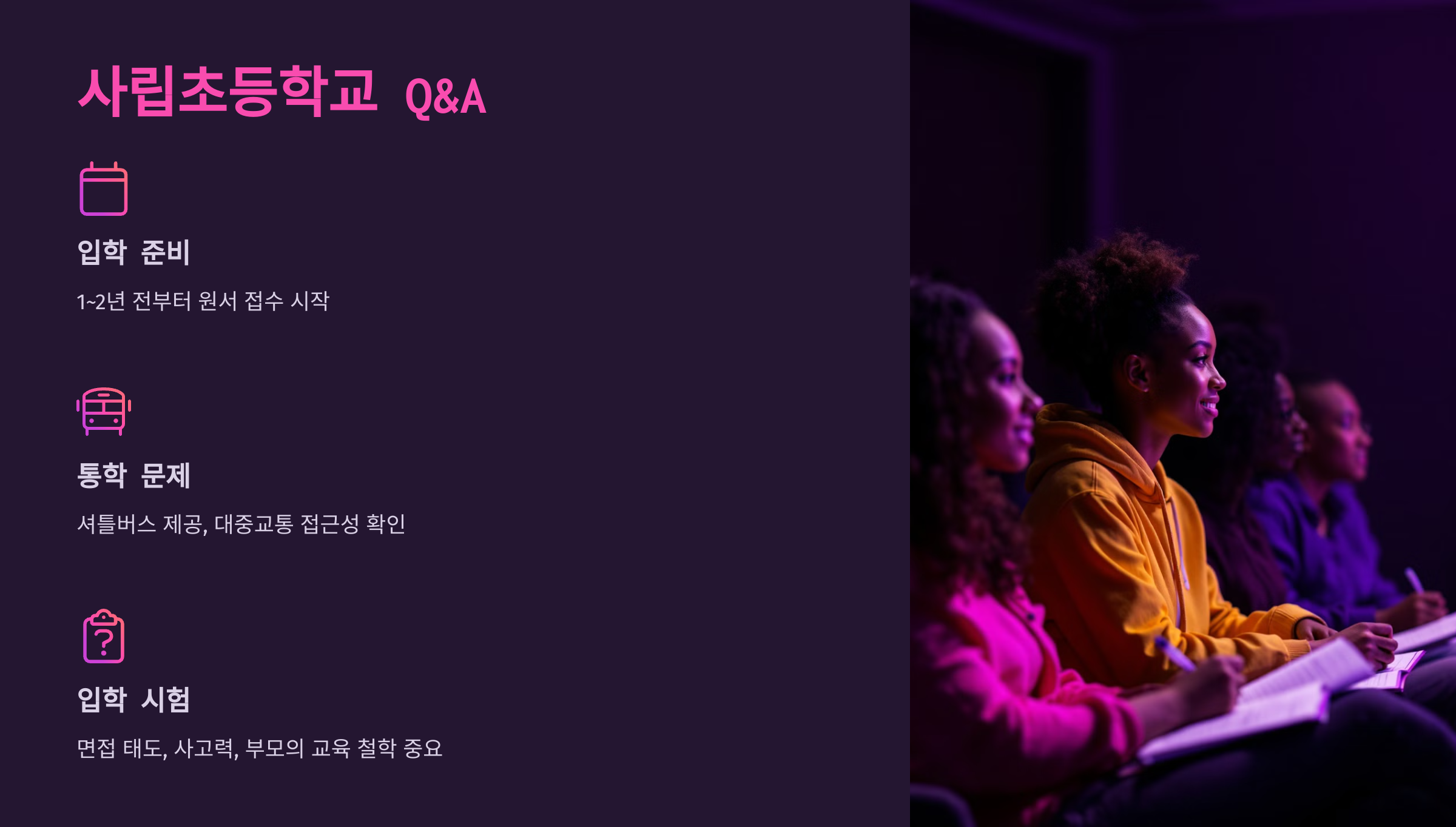 대부분의 사립초등학교는 입학 전 1~2년 전부터 원서 접수를 시작하니, 미리 관심 학교의 입학 요강을 확인하고 준비하는 것이 중요합니다.
