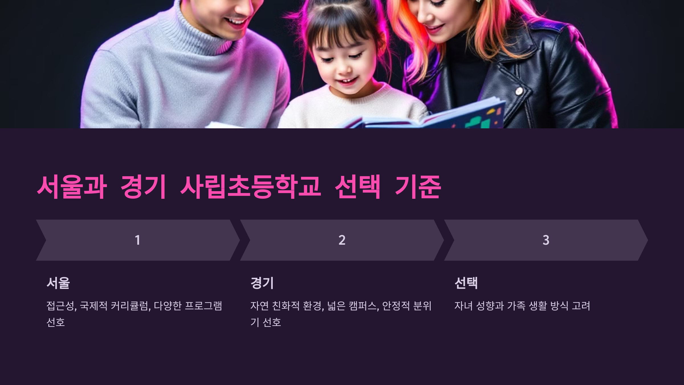 따라서 자녀의 성향과 가족의 생활 방식을 고려하여, 도시 중심의 교육 환경을 선호한다면 서울, 자연과 창의성 중심의 교육을 원한다면 경기를 선택하시는 것이 좋습니다.