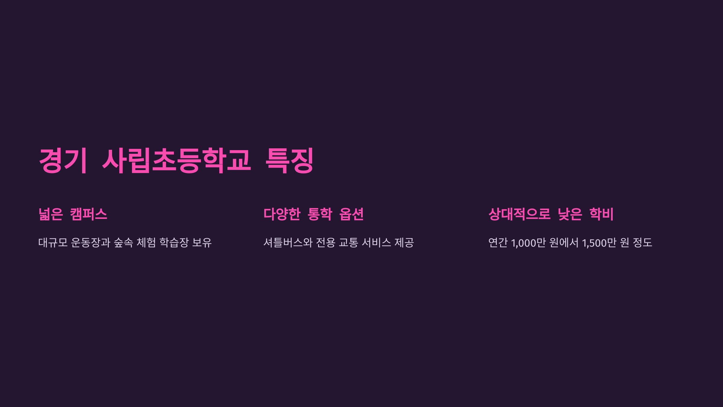 - 예를 들어, 용인이나 분당 지역의 사립초등학교는 대규모 운동장과 숲속 체험 학습장을 갖추고 있습니다.